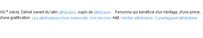 Définition de « attributaire » de source académique (Académie Française, parution de 1986).Merci à Jeannot et Micheline pour la numérisation du mot attributaire.