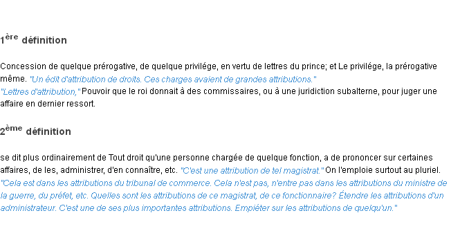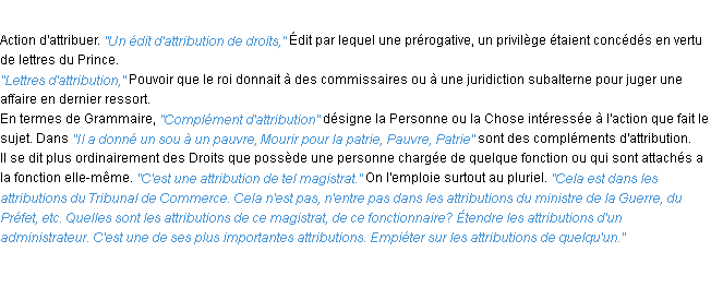 Ancienne signification du terme « attribution », parution de 1835, dictionnaire académique Français.
