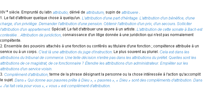 Définition « attribution » du dictionnaire académique Français, parution de l’année 1932.