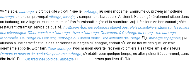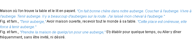 Ancienne signification éditée en 1798 pour le terme « auberge » par l’Académie Française.Merci à Claudette et Gaston pour la numérisation du mot auberge.