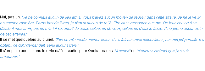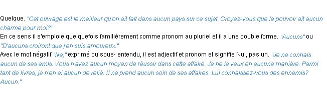 Ancienne signification développée en 1798 par l’académie Française (ACAD - 1798).Merci à Sidonie et Noel pour la numérisation du mot aucun.