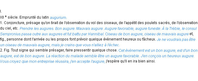 Ancienne signification du terme « augure », parution de 1798, dictionnaire académique Français.Merci à Didier et Aimée pour la numérisation du mot augure.