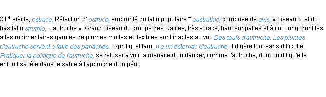Ancienne signification éditée en 1798 pour le terme « autruche » par l’Académie Française.Merci à Axelle et Claudette pour la numérisation du mot autruche.