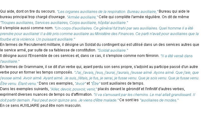 Ancienne définition académique pour le terme « auxiliaire » (parue en 1835).
