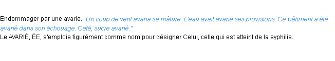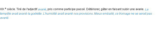 Signification éditée en 1876 pour le terme « avarier » par Emile Littré.Merci à Adélaïde et Maxime pour la numérisation du mot avarier.