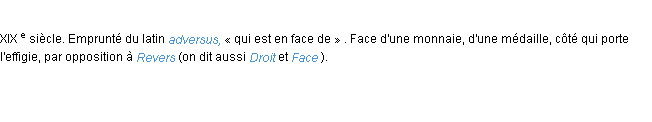 Définition de l’Académie Française (édition de 1986) pour le mot « avers ».