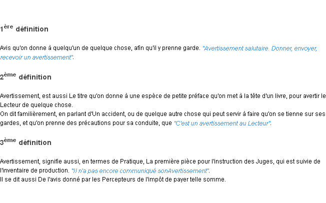 Ancienne définition « avertissement » du dictionnaire académique Français, parution de l’année 1835.