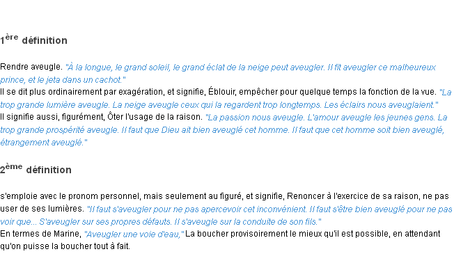 Ancienne définition de « aveugler » de source académique (Académie Française, parution de 1835).