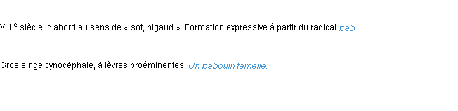 Ancienne signification développée en 1798 par l’académie Française (ACAD - 1798).Merci à Papillion et Marielle pour la numérisation du mot babouin.