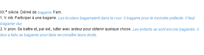 Signification éditée en 2008 pour le terme « bagarrer » par l’équipe de wiktionary France.- Autres Recherches