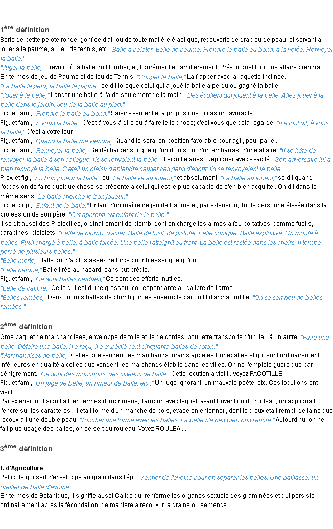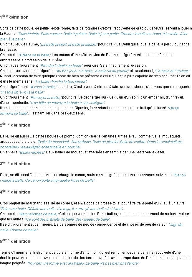 Ancienne définition « balle » du dictionnaire académique Français, parution de l’année 1835.