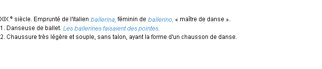 Définition issue du dictionnaire wiktionary pour le mot « ballerine ».Merci à Ghislain et Joël pour la numérisation du mot ballerine.