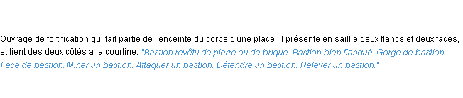 Ancienne signification développée en 1798 par l’académie Française (ACAD - 1798).Merci à Micheline et Florette pour la numérisation du mot bastion.
