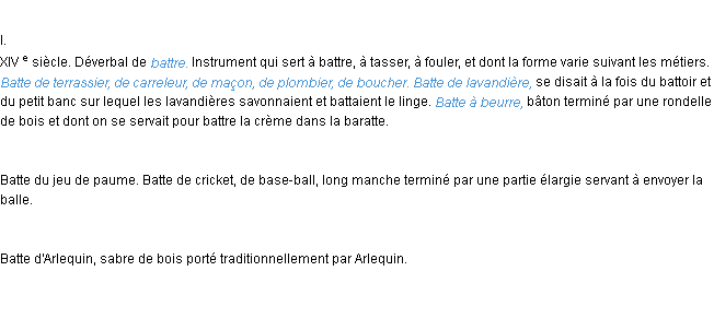 Ancienne signification éditée en 1798 pour le terme « batte » par l’Académie Française.Merci à Eloi et Claire pour la numérisation du mot batte.