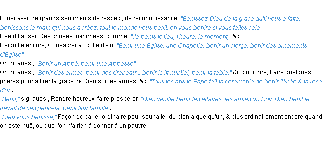 Ancienne signification éditée en 1694 pour le terme « benir » par l’Académie Française.Merci à Iréné et Nicolas pour la numérisation du mot benir.