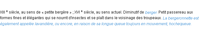 Ancienne signification développée en 1798 par l’académie Française (ACAD - 1798).Merci à Nicolette et étienne pour la numérisation du mot bergeronnette.
