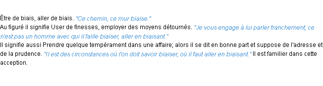 Ancienne définition académique pour le terme « biaiser » (parue en 1835).