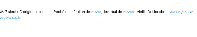 Définition de « bigle » issue du Littré (Auteur Emile Littré, édité en 1876).Merci à Telesphore et Barnabé pour la numérisation du mot bigle.