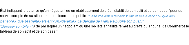 Ancienne signification issue du dico de l’Académie Française, parue en 1798.Merci à Guillaume et Eloi pour la numérisation du mot bilan.