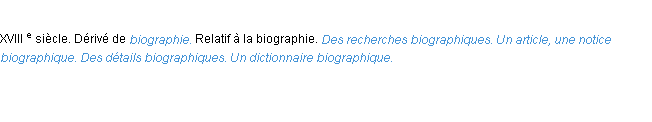 Définition d’Emile Littré (édition de 1876) pour le mot « biographique ».Merci à Danièle et Adèle pour la numérisation du mot biographique.