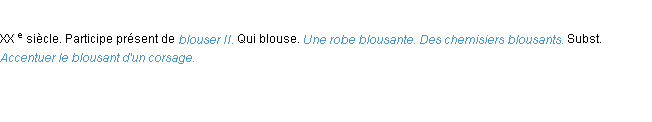 Définition du mot « blousant » (source wiktionary 2011).Merci à Maximilienne et Germaine pour la numérisation du mot blousant.
