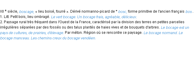 Définition de « bocage » de source académique (Académie Française, parution de 1986).