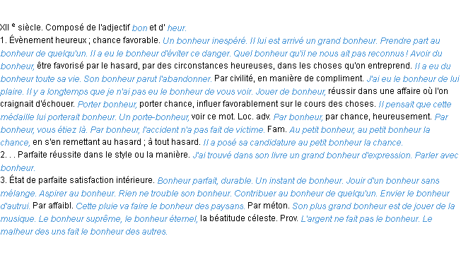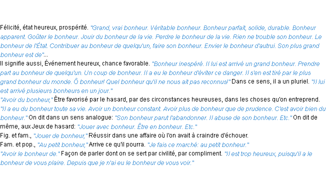 Ancienne signification du terme « bonheur », parution de 1798, dictionnaire académique Français.Merci à Solange et Papillion pour la numérisation du mot bonheur.