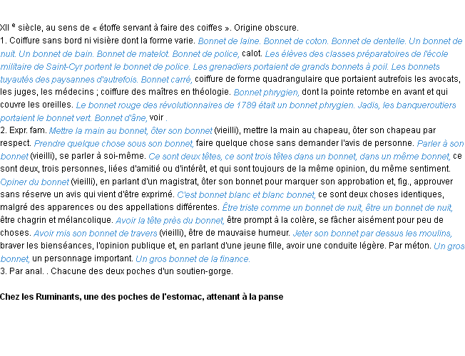 Signification du terme « bonnet », parution de 1986, dictionnaire académique Français.