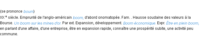 Définition de « boom » de source académique (Académie Française, parution de 1986).- Autres Recherches