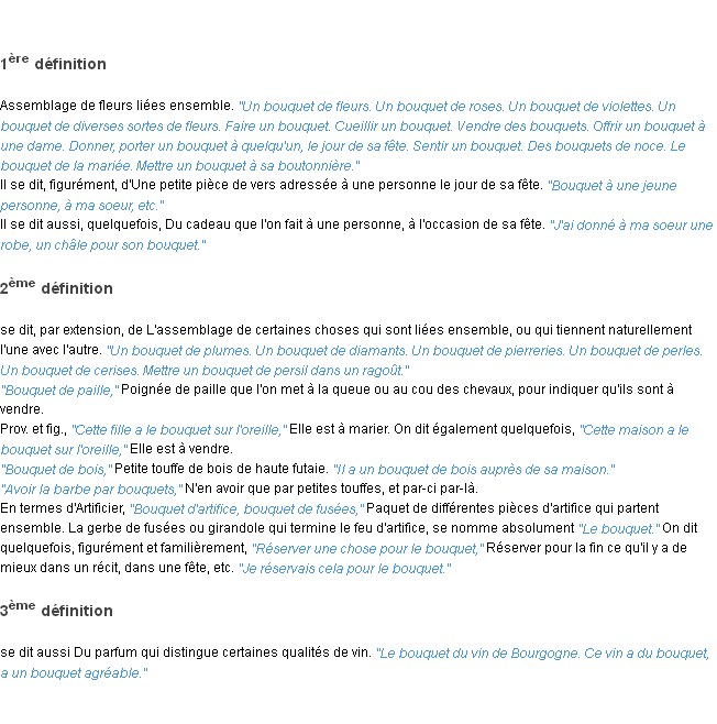 Définition académique pour le terme « bouquet » (parue en 1986).