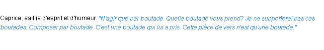 Ancienne signification parue en 1798 dans dictionnaire de l’Académie Française.Merci à Faustine et Guillaume pour la numérisation du mot boutade.