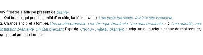 Ancienne définition « branlant » du dictionnaire académique Français, parution de l’année 1798.Merci à Hortense et Solange pour la numérisation du mot branlant.