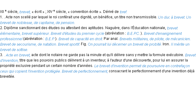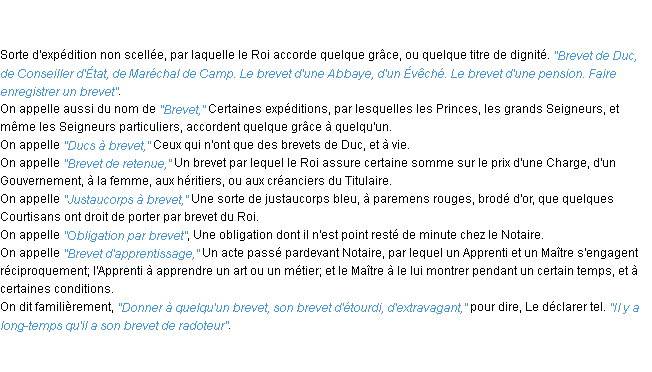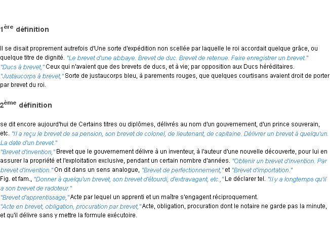 Ancienne signification éditée en 1835 pour le terme « brevet » par l’Académie Française.