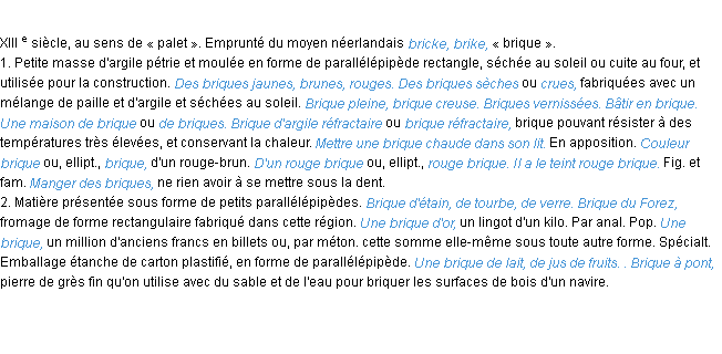 Ancienne signification éditée en 1798 pour le terme « brique » par l’Académie Française.Merci à Henriette et Mignon pour la numérisation du mot brique.