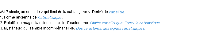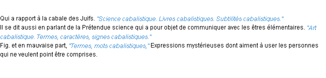 Ancienne signification issue du dico de l’Académie Française, parue en 1798.Merci à Fabien et Gérald pour la numérisation du mot cabalistique.