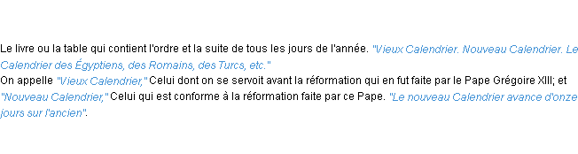 Ancienne définition académique pour le terme « calendrier » (parue en 1798).Merci à Gisèle et Blaise pour la numérisation du mot calendrier.