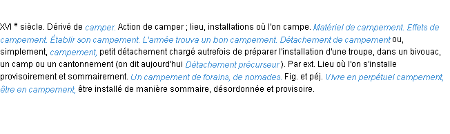 Ancienne signification issue du dico de l’Académie Française, parue en 1798.Merci à Fernand et édith pour la numérisation du mot campement.