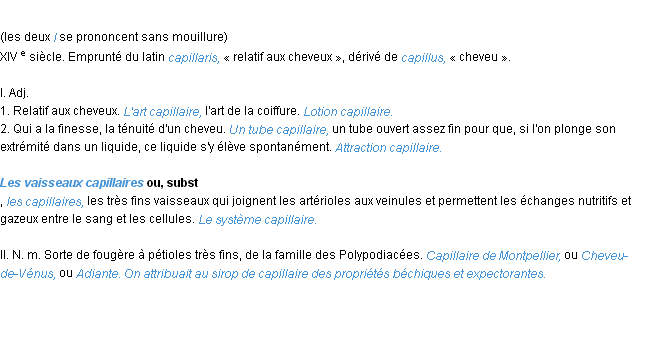 Définition académique pour le terme « capillaire » (parue en 1986).