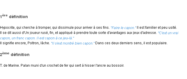 Ancienne signification issue du dico de l’Académie Française, parue en 1798.Merci à Sylvain et Brice pour la numérisation du mot capon.
