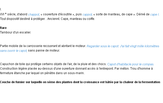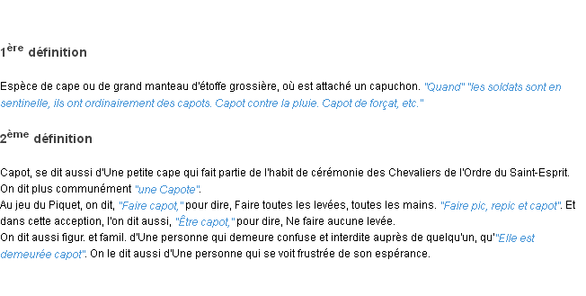 Ancienne signification parue en 1798 dans dictionnaire de l’Académie Française.Merci à Cerise et Gérald pour la numérisation du mot capot.