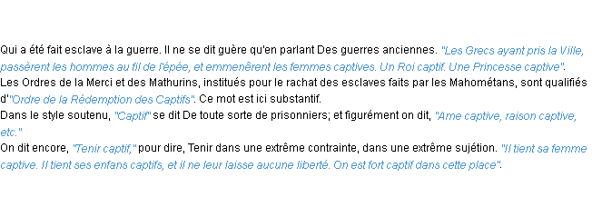 Ancienne signification du terme « captif », parution de 1798, dictionnaire académique Français.Merci à Lionel et Emmanuelle pour la numérisation du mot captif.