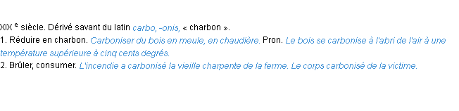 Définition développée dans dictionnaire d’Emile Littré (ancienne édition de 1876).Merci à Rémy et Edwige pour la numérisation du mot carboniser.