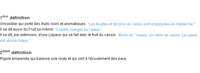 Définition développée dans dictionnaire d’Emile Littré (ancienne édition de 1876).Merci à Danièle et Seraphine pour la numérisation du mot cassis.