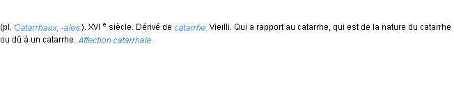 Ancienne signification du terme « catarrhal », parution de 1798, dictionnaire académique Français.Merci à Jacques et Gervais pour la numérisation du mot catarrhal.