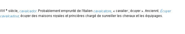 Ancienne définition de « cavalcadour » de source académique (Académie Française, parution de 1798).Merci à Luce et Cécile pour la numérisation du mot cavalcadour.