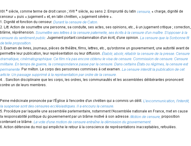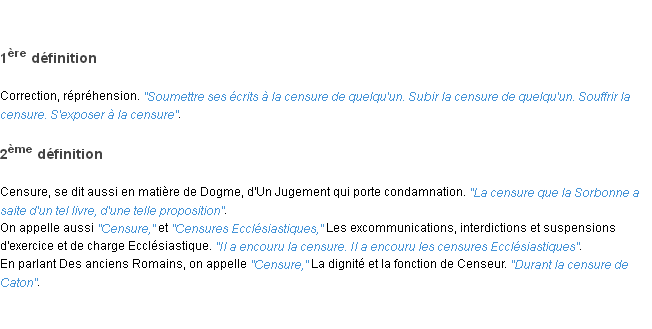 Ancienne définition académique pour le terme « censure » (parue en 1835).