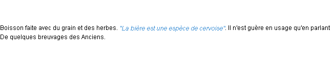Ancienne signification parue en 1798 dans dictionnaire de l’Académie Française.Merci à Gervais et Romain pour la numérisation du mot cervoise.