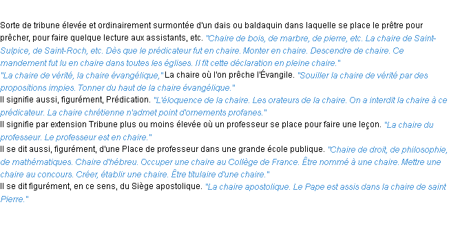 Ancienne signification développée en 1798 par l’académie Française (ACAD - 1798).Merci à Adrien et Faustine pour la numérisation du mot chaire.