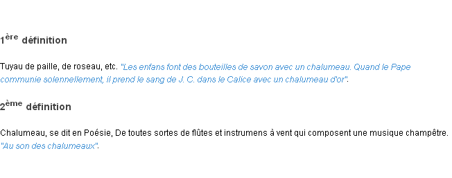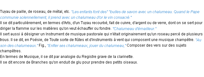 Ancienne signification développée en 1798 par l’académie Française (ACAD - 1798).Merci à Noel et Josiane pour la numérisation du mot chalumeau.