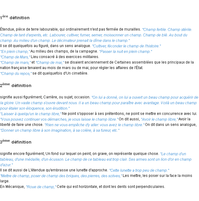 Ancienne signification du terme « champ », parution de 1835, dictionnaire académique Français.